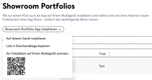 - In der Übersicht Ihrer ‚Showroom Portfolios‘ finden Sie, sobald Sie eine oder mehrere Portfolios erstellt haben, ganz oben das ‚Showroom Portfolio App installieren‘. Sie können den Link direkt aufrufen, kopieren oder den QR Code mit Ihrem Smartphone oder Tablet scannen.