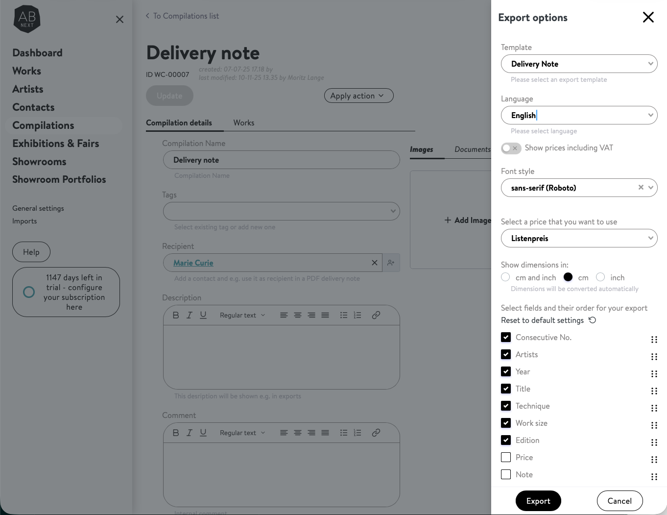 Add a header for your exports in the general settings of Artbutler NEXT.